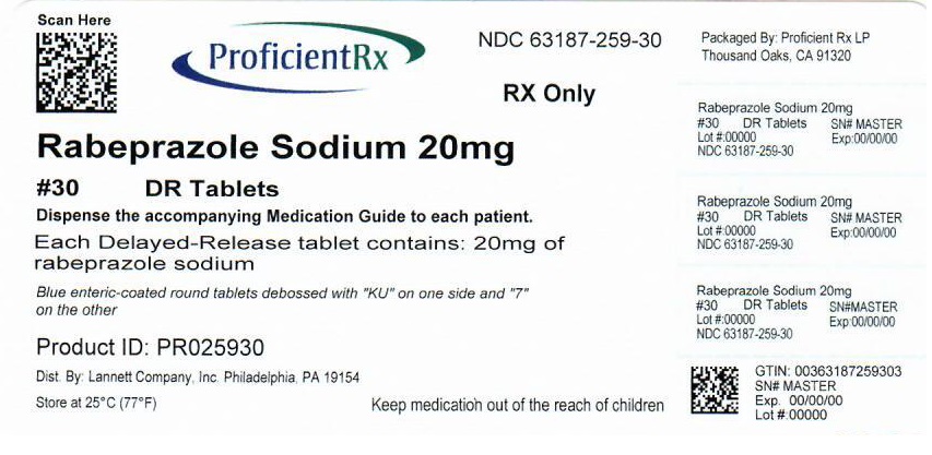 The following 6 images provide visual information about the product associated with Rabeprazole Sodium NDC 63187-259 by Proficient Rx Lp, such as packaging, labeling, and the appearance of the drug itself. This resource could be helpful for medical professionals, pharmacists, and patients seeking to verify medication information and ensure they have the correct product.
