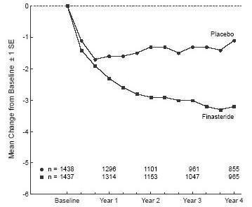 In a long-term efficacy and safety study, prostate volume was assessed yearly by magnetic resonance imaging (MRI) in a subset of patients. In patients treated with finasteride who remained on therapy, prostate volume was reduced compared with both baseline and placebo throughout the 4-year study. Finasteride decreased prostate volume by 17.9% (from 55.9 mL at baseline to 45.8 mL at 4 years) compared with an increase of 14.1% (from 51.3 mL to 58.5 mL) in the placebo group (p<0.001). (See Figure 3.)