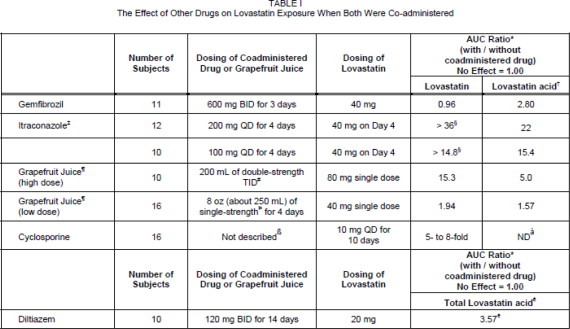 This is a warning about drugs that may interact with lovastatin, a medication used to lower cholesterol levels, and increase the risk of muscle damage called myopathy/rhabdomyolysis. The text outlines various interacting agents, such as strong CYP3A4 inhibitors, HIV protease inhibitors, gemfibrozil, cyclosporine, danazol, diltiazem, dronedarone, verapamil, and amiodarone, and provides prescribing recommendations for each. It advises against exceeding a certain dose of lovastatin daily or using it with grapefruit juice.*