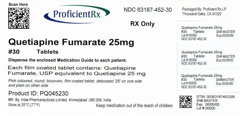 This is a description of a medication identified with the National Drug Code (NDC) 63187-452-30. The medication is Quetiapine Fumarate 25mg. It comes in a package containing 30 tablets, each coated and pink colored, round and biconvex with '25' debossed on one side and plain on the other. The manufacturer of the drug is Intas Pharmaceuticals Limited located in Anmedabad -380 009, India. Each tablet contains Quetiapine Fumarate equivalent to Quetiapine 25 mg. The medication guide enclosed in the package should be given to each patient. The medication should be stored at 25°C (77°F) and kept out of the reach of children. There are three labels with different lot numbers and one with an expiration date of 00/00/00. The GTIN is 0363187452308. The information provided is primarily on the packaging and labeling details of the drug.*