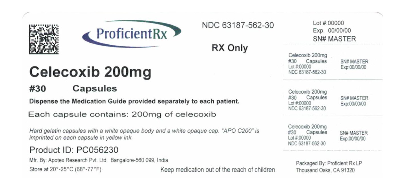 This is a medication prescription for Celecoxib 200mg, which comes in a bottle of 30 capsules with a Lot #00000 and Expiration date of 00/00/00. The capsules are hard gelatin with a white opaque body and a white opaque cap. They are imprinted with "APO C200" in yellow ink. The NDC code is 63187-562-30, and each capsule contains 200mg of Celecoxib. The medication guide should be given to each patient separately. The product is manufactured by Apotex Research Pvt. Ltd in India and packaged by Proficient Rx LP. The medication should be stored at 20°C to 25°C and kept away from children.*