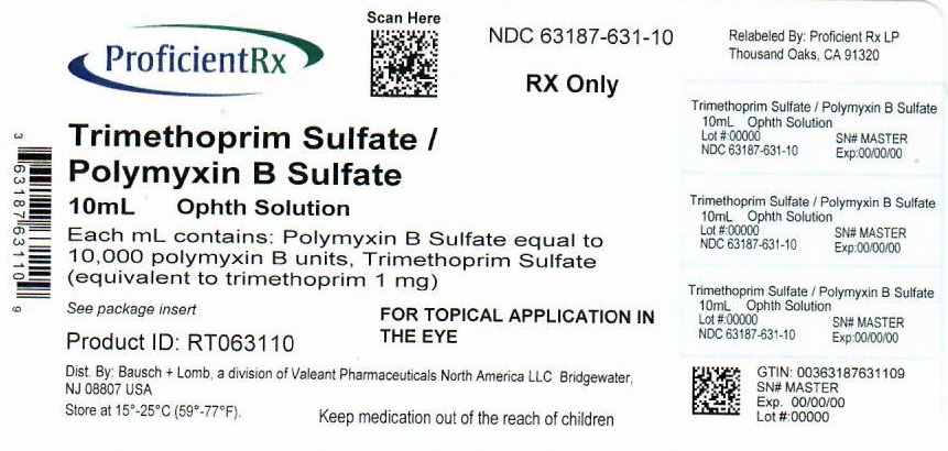 This is a description of a medication with the NDC 63187-631-10, a Trimethoprim Sulfate/Polymyxin B Sulfate Eye Solution. It contains 10,000 polymyxin B units and equivalent to trimethoprim 1 mg. This medication is meant for topical application in the eye and is distributed by Bausch + Lomb in Bridgewater, NJ. The package insert and expiration date should be checked, and the medication should be stored between 15°C-25°C.*