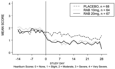 This is a graph showing heartburn scores for a study involving a placebo group (n=68), a RAB 10mg group, and a RAB 20mg group. The scores range from 0 (no heartburn) to 4 (very severe heartburn) and are recorded on study days 0, 7, 14, 21, and 28. There is no additional information available for the study.*