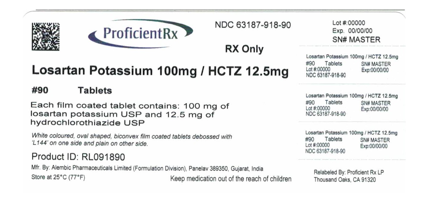 The following 3 images provide visual information about the product associated with Losartan Potassium And Hydrochlorothiazide NDC 63187-918 by Proficient Rx Lp, such as packaging, labeling, and the appearance of the drug itself. This resource could be helpful for medical professionals, pharmacists, and patients seeking to verify medication information and ensure they have the correct product.