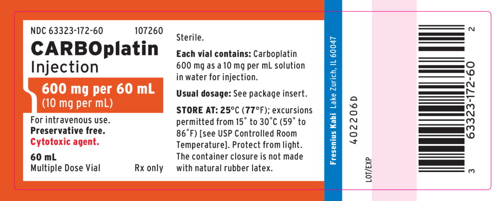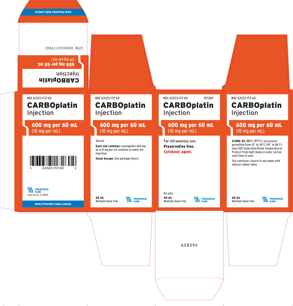 The following 4 images provide visual information about the product associated with Carboplatin NDC 63323-172 by Fresenius Kabi Usa, Llc, such as packaging, labeling, and the appearance of the drug itself. This resource could be helpful for medical professionals, pharmacists, and patients seeking to verify medication information and ensure they have the correct product.
