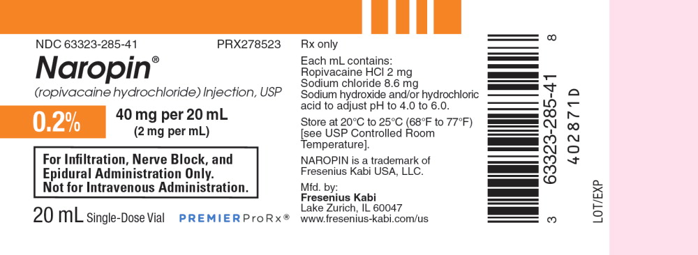 This is a description of Naropin (ropivacaine hydrochloride) injection, USP. It is indicated for infiltration, nerve block, and epidural administration only, not for intravenous administration. Each mL contains 5 mg of Ropivacaine HCI and 8 mg of Sodium chloride. The pH is adjusted to 4.0 to 6.0 with sodium hydroxide and/or hydrochloric acid. It is available in a 30 mL single-dose vial by PREMIERProRx®. The product should be stored at 20°C to 25°C (68°F to 77°F). Naropin is a trademark of Fresenius Kabi USA, LLC. Produced by Fresenius Kabi in Lake Zurich, IL. Lot/Exp: 402868D.*