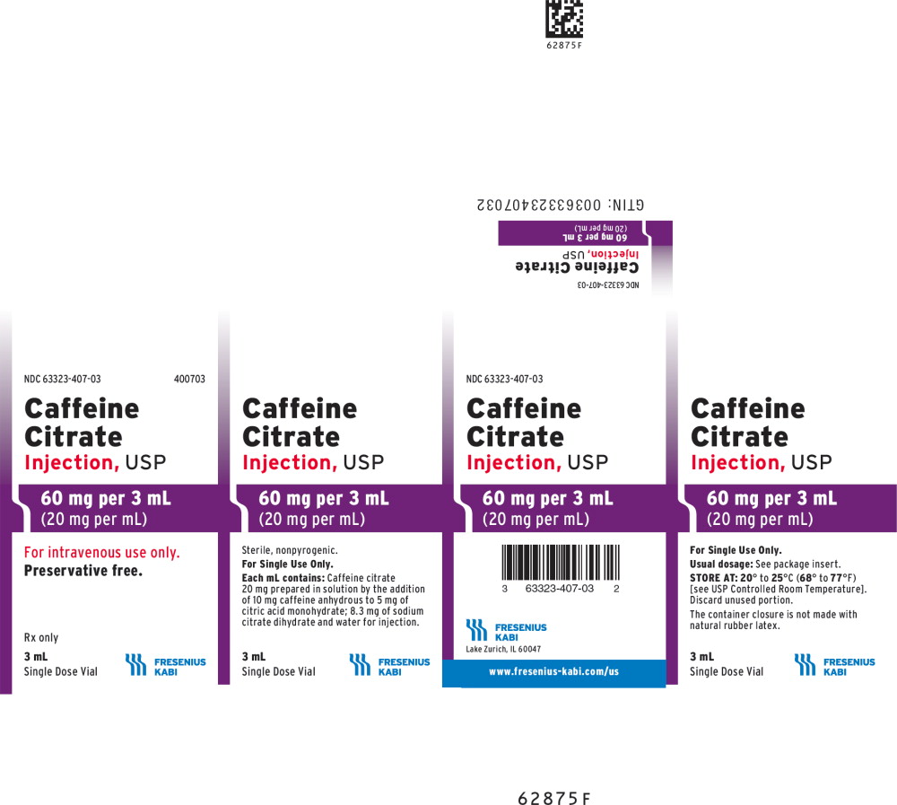 This is a description of a pharmaceutical product with NDC number 63323-407-03, containing Sterile, nonpyrogenic Caffeine Citrate for intravenous use. Each mL includes Caffeine citrate, caffeine anhydrous, citric acid, sodium citrate dihydrate, and water for injection. The product is for single use only and should be stored at 20° to 25°C. It is preservative-free and comes in a 3 mL Single Dose Vial. The container closure does not contain natural rubber latex.*
