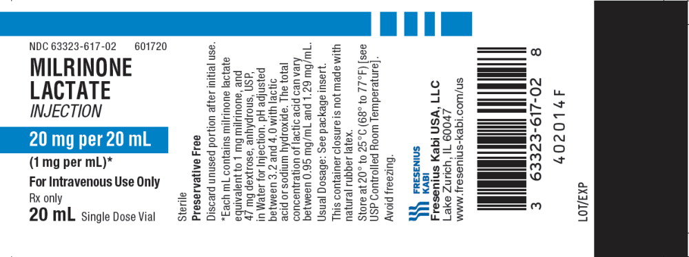 MILRINONE LACTATE INJECTION is a medication that comes in a single dose vial of 20 mg per 20 mL, intended for intravenous use only. The NDC number, which is used to identify medications in the US, is 63323-617-02, and the medication contains 1mg per mL. No additional information is available from the given text.*