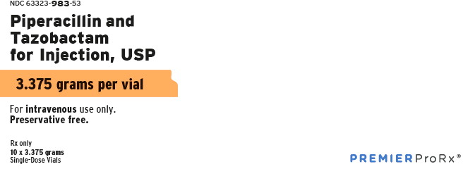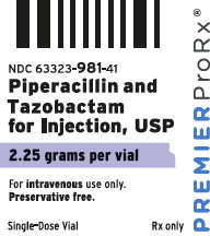 This is a product description for Piperacillin and Tazobactam for Injection, USP. It is available in 2.25-gram vials for intravenous use only, and is preservative-free. The packaging includes 10 single-dose vials of 2.25 grams each. The product is identified with the NDC code 63323-981-53 and is sold by PREMIERProRx.*