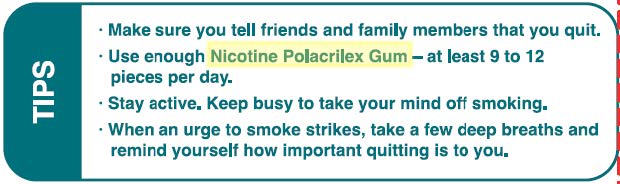 This text provides quitting tips for individuals trying to quit smoking. It suggests controlling physical cravings for nicotine by using Nicotine Polacrilex Gum, getting rid of all signs of smoking, staying active, and maintaining a positive attitude during the difficult first week.*