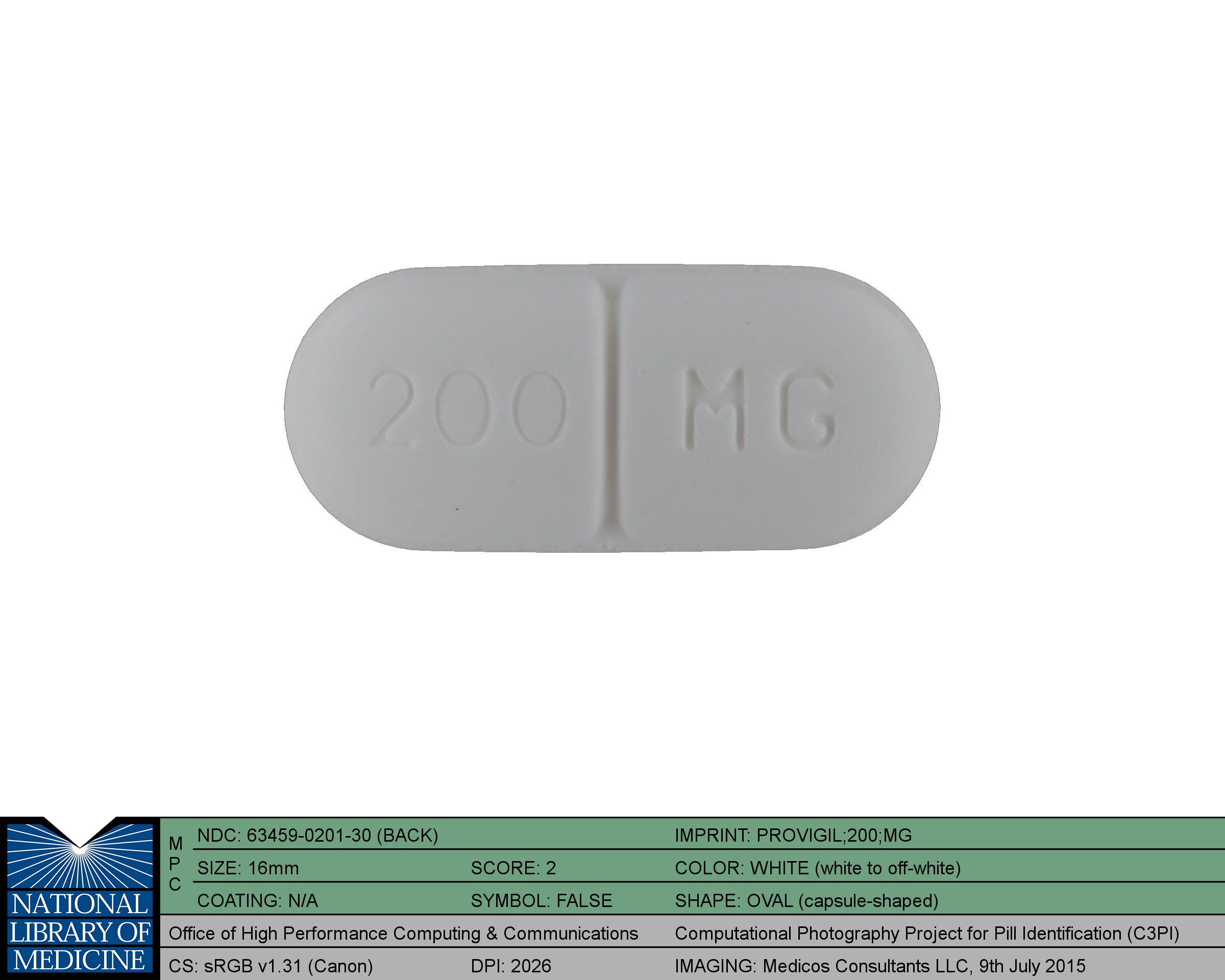 Provigil by Cephalon, Llc is a white oval tablet about 16 mm in size, imprinted with PROVIGIL, 200 and MG. The product is a human prescription drug with active ingredient(s) modafinil. The shape, size, imprinting and color are characteristics of an oral solid dosage form of a medicinal product.