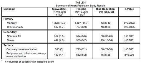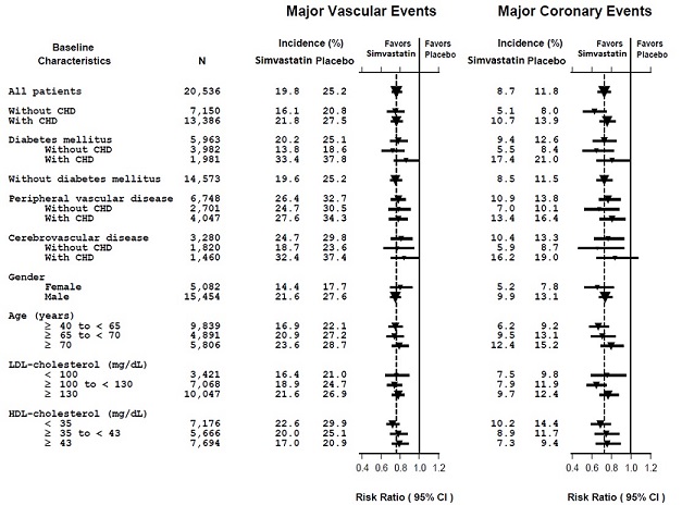 This appears to be a table of data related to a study on major vascular events and major coronary events in patients taking Simvastatin versus a placebo. It includes patient characteristics and instances of various diseases, as well as risk ratios. However, the data is not presented in a clear format and the exact details are difficult to decipher.*