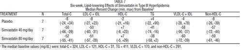 The table shows adverse reactions reported by patients treated with Simvastatin and those treated with a placebo. The reactions listed are those that affected 2% or more of patients taking Simvastatin and affecting more patients than the placebo. These reactions include various disorders across the body systems such as body swelling, abdominal pain, atrial fibrillation, constipation, diabetes mellitus, myalgia, headache, insomnia, eczema, and urinary tract infections.*