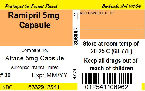 This is a medication package of Ramipril 5mg capsules packaged by Begane Ranch and manufactured by Aurobindo Pharma Limited. The package contains 30 capsules with an expiration date indicated as MM/YY (month and year) and should be stored at room temperature between 20-25 degrees Celsius (68-77 degrees Fahrenheit). It is important to keep all drugs out of reach of children. The National Drug Code (NDC) for this product is 6362912541 and the batch number is 012541106962.*