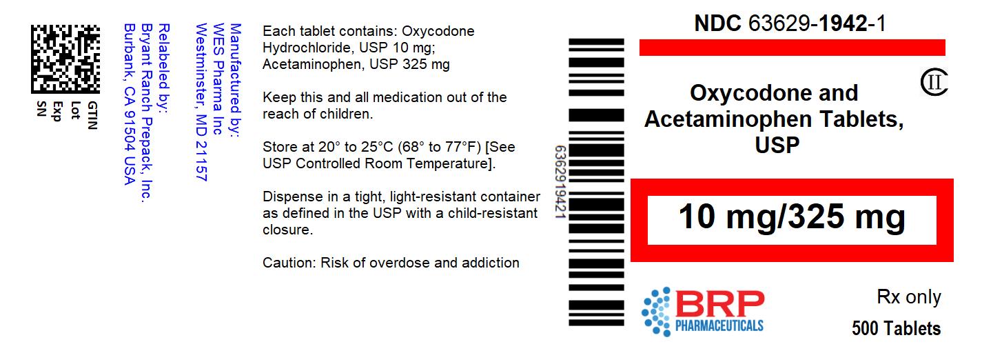 The following 3 images provide visual information about the product associated with Oxycodone And Acetaminophen NDC 63629-1942 by Bryant Ranch Prepack, such as packaging, labeling, and the appearance of the drug itself. This resource could be helpful for medical professionals, pharmacists, and patients seeking to verify medication information and ensure they have the correct product.