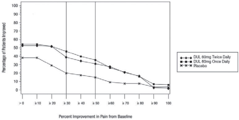 The text indicates data on percentage of patients improved through a medication called DUL administered once daily. The percentage improvements are not given clearly, but present in the form of scattered numbers. The last line shows the percent improvement in pain from the baseline. However, it is not clear what the baseline value represents. Therefore, the available text provides insufficient information to make a useful description.*