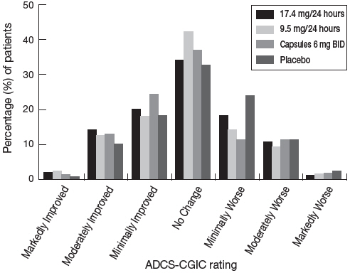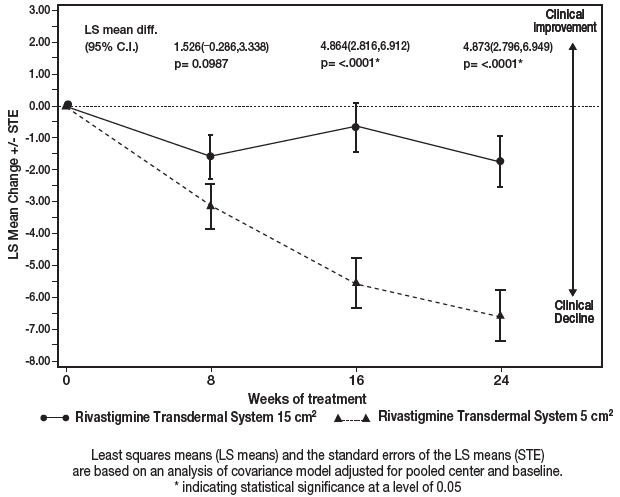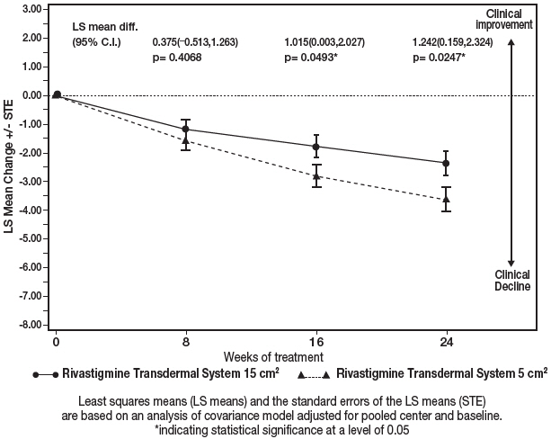 This appears to be a statistical analysis comparing the improvement from treatment with two different transdermal systems using rivastigmine. The data includes LS means and standard errors for both treatments at various time intervals (8, 16, and 24 weeks) and indicates statistical significance at a level of 0.05.*