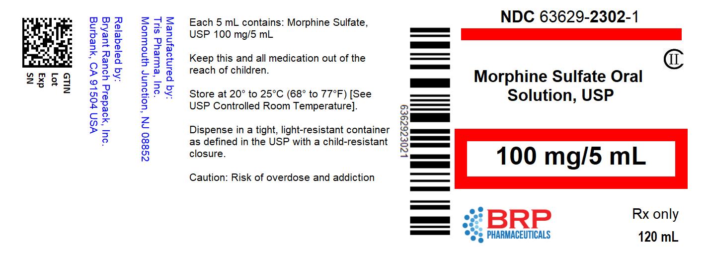This is a product description of Morphine Sulfate oral solution, an Rx-only medicine containing 100mg/5mL of Morphine Sulfate, USP. It is advised to store this medicine at 20°-25°C and keep it out of children's reach. The medication is packed in a tight, light-resistant container with a child-resistant closure to avoid overdose and addiction. The NDC number is 63629-2302-1, and it comes in a 120 mL bottle.*