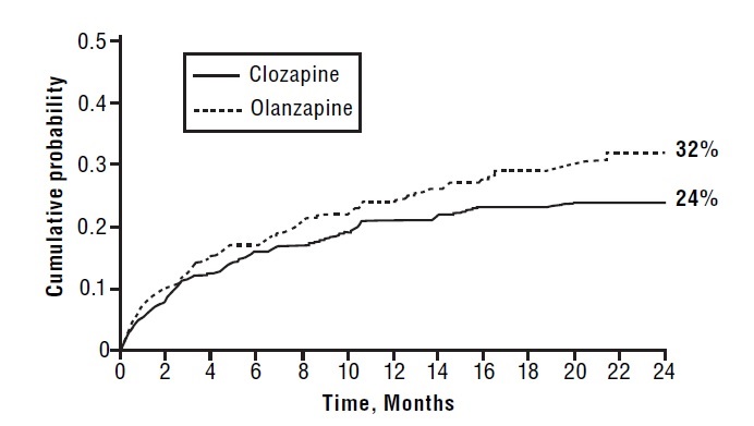 The text appears to be a graph indicating the cumulative probability of two drugs, Clozapine and Olanzapine, over a period of 24 months. The X-axis represents time in months and the Y-axis shows the cumulative probability. There is not much additional information available from the text.*
