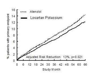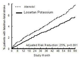 The text suggests a clinical trial or study where 80 patients have experienced an "event". It appears that two groups were studied, one taking Losartan Potassium and the other taking a placebo. The study possibly lasted 24 weeks or less, as data is shown at 12 and 24 weeks. The risk reduction percentage for Losartan Potassium compared to the placebo is 16.1%. However, the context and type of event studied is not given, leading to incomplete information.*