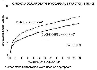 This is a chart showing the cumulative event rate for cardiovascular death, myocardial infarction, and stroke for those taking a placebo with aspirin versus those taking clopidogrel with aspirin. Other standard therapies were also used as appropriate. The chart shows that there was a significant difference in the event rate between the two groups. The data was tracked for several months.*