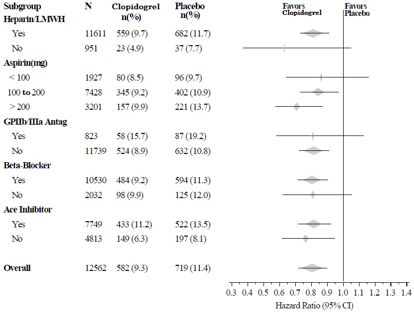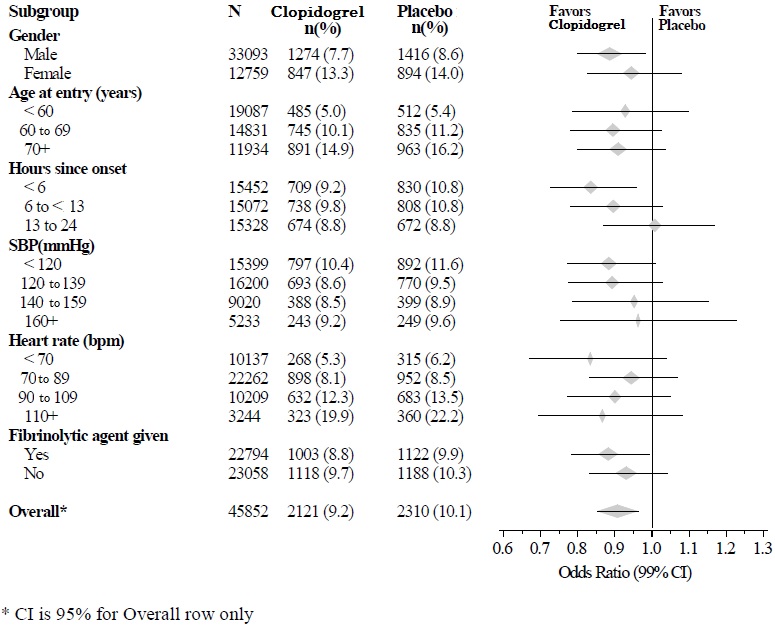 This document appears to be a statistical report providing information on a clinical trial related to a medication called Clopidogrel. The report includes data on subgroups of participants in the trial, such as their gender, age, blood pressure, and whether they were given a fibrinolytic agent or not. The report also includes figures regarding the effectiveness of Clopidogrel versus Placebo. However, the document seems incomplete as important headings of the column are not available.*