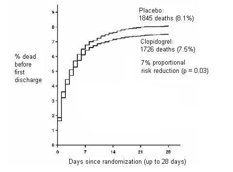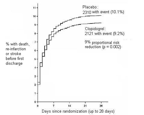 This text describes data from a study comparing the use of placebo versus clopidogrel in reducing the risk of death, reinfarction or stroke before a patient is discharged from the hospital. The number of patients who experienced an event is provided for each group, along with the proportional risk reduction for clopidogrel compared to placebo. The results were statistically significant (p=0.002). The graph shows the number of days since randomization up to 28 days.*