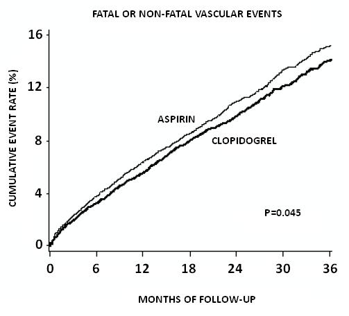 This text presents a comparison of the cumulative event rate for fatal or non-fatal vascular events between aspirin and clopidogrel. The data shows a statistical significance (P=0.045) in favor of one of the treatments but the specific results are not available. The data is presented in the form of a graph with months of follow-up on the x-axis and cumulative event rate on the y-axis.*