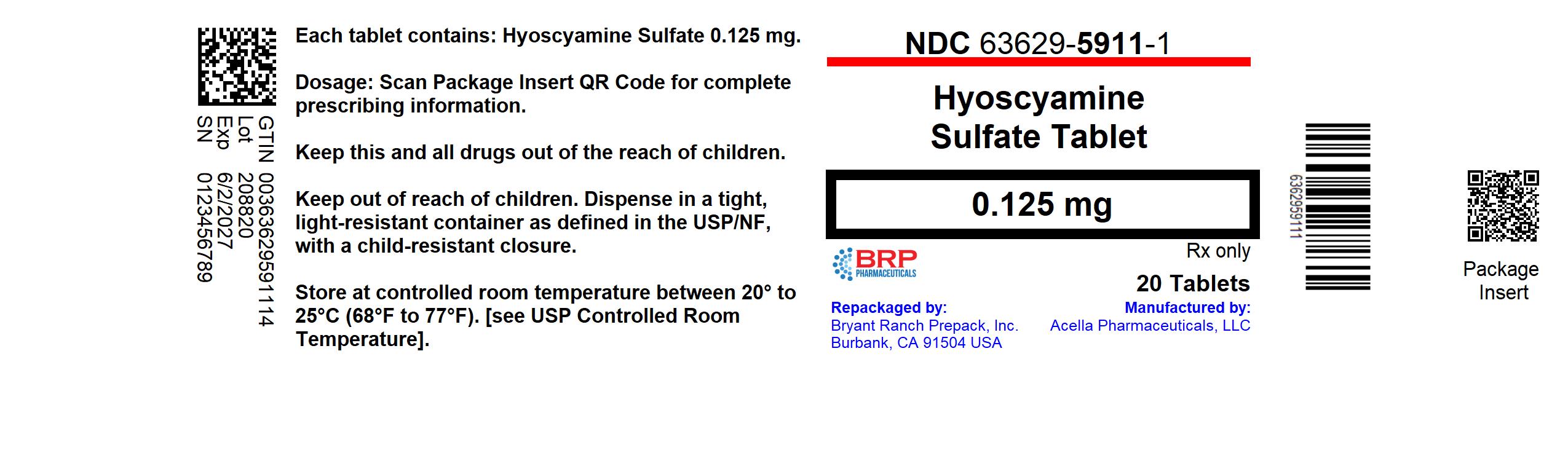 This is a description of a medication containing Hyoscyamine Sulfate 0.125 mg per tablet. The National Drug Code (NDC) for the medication is 63629-5911-1. The dosage information is advised to be obtained by scanning the package insert QR code. The medication is required to be stored at controlled room temperature between 20° to 25°C (68°F to 77°F). It should be kept out of reach of children and dispensed in a light-resistant container with a child-resistant closure. The prescribing information advises to keep all drugs out of the reach of children. The medication is manufactured by Bryant Ranch Prepack, Inc., and packaged by Acella Pharmaceuticals, LLC.*