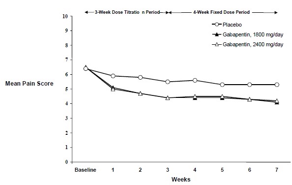 The given text is describing a graph that shows the percentage of patients who responded to a pain reduction treatment at the endpoint of two studies on PHN (Postherpetic neuralgia). The graph shows the percentage of patients who experienced a 2-50% reduction in pain score. The studies had two treatment groups with varying dosages of GBP (Gabapentin). The graph also includes asterisks indicating significant differences in the treatments.*