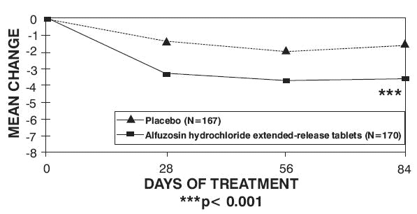 The text describes a study, which involved two groups of people. One group (N=152) received placebo, while the other group (N=137) received Alfuzosin hydrochloride extended-release tablets. The study lasted for 28, 56, and 84 days of treatment. The asterisks indicate that the results were statistically significant (p<0.01). The text does not provide further details on the study or its findings.*