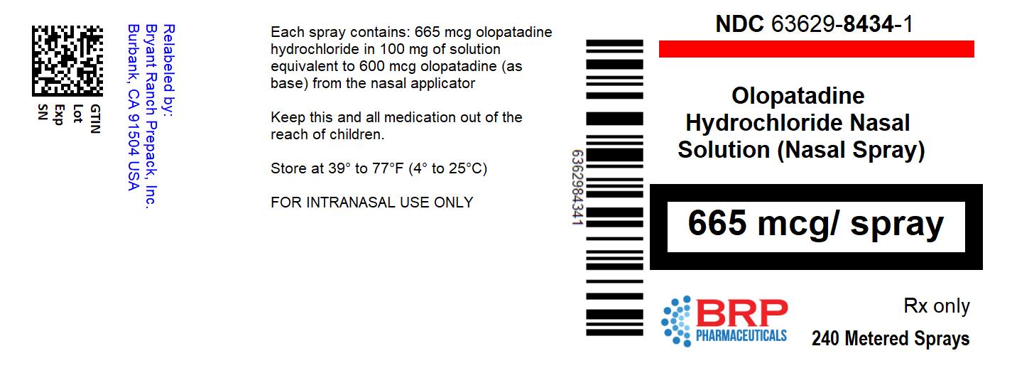 Olopatadine hydrochloride nasal solution (nasal spray) is supplied in a white plastic bottle with a metered-dose manual spray pump, a white nasal applicator, a blue overcap and a blue clip in a box of 1 (NDC: 63629-8434-1). Each trade size bottle contains 30.5 g of clear, colorless liquid and will provide 240 metered sprays. After priming [see Dosage and Administration (2)], each spray delivers a fine mist containing 665 mcg of olopatadine hydrochloride in 100 microliters of formulation through the nozzle.