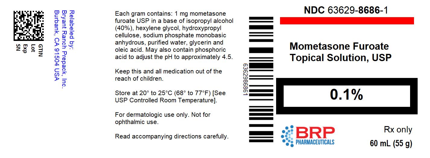 This is a description of a medication called "Mometasone Furoate Topical Solution, USP" with the NDC code 63629-8686-1. It is for dermatologic use only and should not be used for ophthalmic purposes. Each gram of the solution contains 1mg of mometasone furoate USP in a base of isopropyl alcohol, hexylene glycol, hydroxypropyl cellulose, sodium phosphate monobasic anhydrous, purified water, glycerin, and oleic acid. Those who use this medication should keep it out of reach of children and store it at 20° to 25°C (68° to 77°F). It also states to read the accompanying directions carefully.*