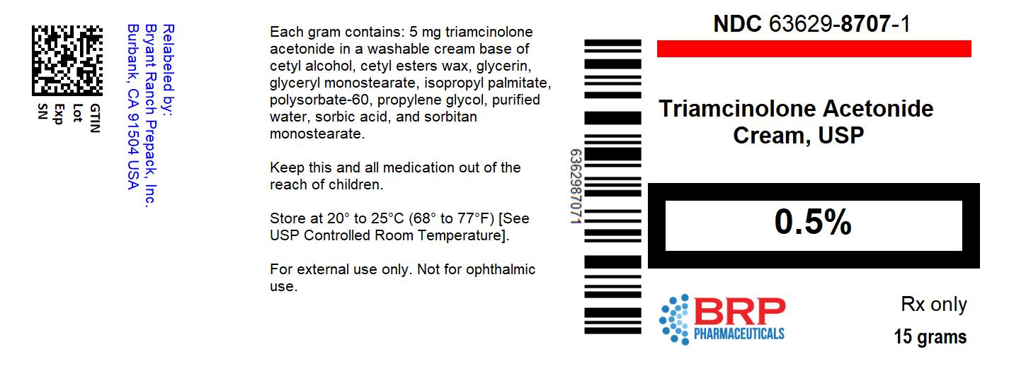 The following 2 images provide visual information about the product associated with Triamcinolone Acetonide NDC 63629-8707 by Bryant Ranch Prepack, such as packaging, labeling, and the appearance of the drug itself. This resource could be helpful for medical professionals, pharmacists, and patients seeking to verify medication information and ensure they have the correct product.