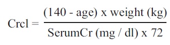 This appears to be a formula to calculate the estimated glomerular filtration rate (eGFR) using the Cockcroft-Gault equation. The equation involves subtracting the age from 140, then multiplying the result by the person's weight in kilograms. The serum creatinine value (in mg/dL) is then multiplied by 72. The final result is the estimated creatinine clearance (CrCl) in mL/min.*