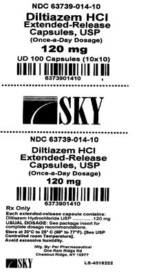 This is a medication description for Diltiazem HCl in the form of capsules with a strength of 120mg. The package contains 100 capsules and the recommended dosage is once-a-day. The National Drug Code is 63739-014-10.*