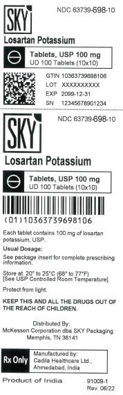 This is a pharmaceutical label for Losartan Potassium Tablets, USP 100 mg, in two different package sizes containing either 100 or 1000 tablets. The label includes the manufacturer's name and product code (SKY-NDC 6373869810 and SKY-NDC 63739.698-10), as well as dosage information and precautions to keep the medication out of reach of children.*