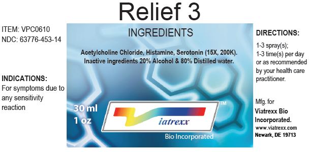 The following 2 images provide visual information about the product associated with Relief 3 NDC 63776-453 by Viatrexx Bio Incorporated, such as packaging, labeling, and the appearance of the drug itself. This resource could be helpful for medical professionals, pharmacists, and patients seeking to verify medication information and ensure they have the correct product.