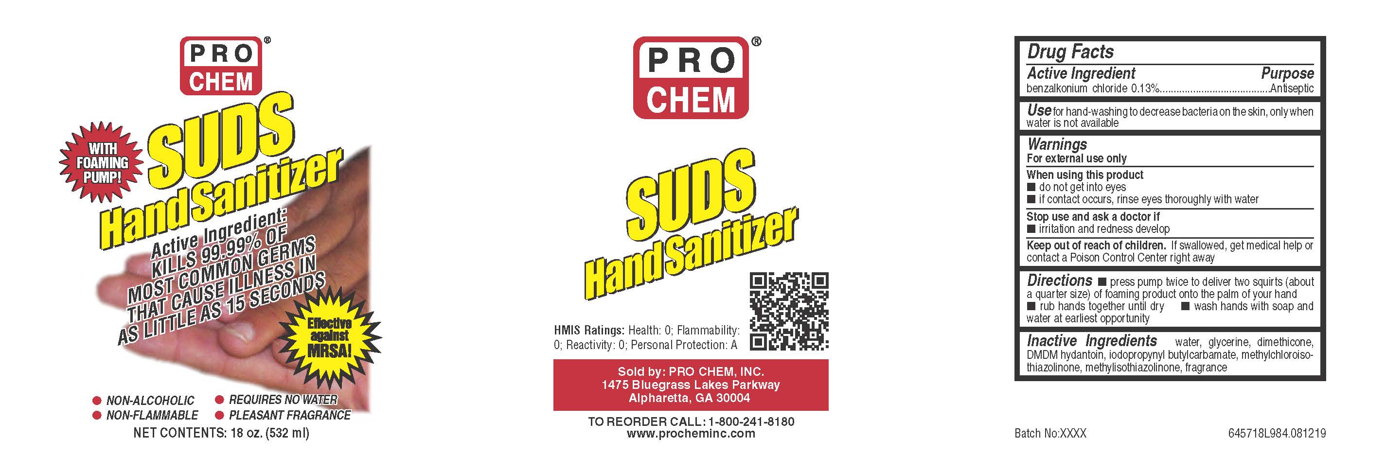 The following image provide visual information about the product associated with Suds Hand Sanitizer NDC 63830-457 by Pro Chem, Inc., such as packaging, labeling, and the appearance of the drug itself. This resource could be helpful for medical professionals, pharmacists, and patients seeking to verify medication information and ensure they have the correct product.