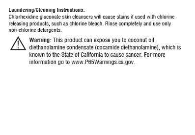 The text contains instructions for laundering/cleaning and a warning regarding exposure to cocamide diethanolamine, which is known to cause cancer in the state of California. It is recommended to avoid using chlorine releasing products while using Chiorhexidine luconate skin cleansers and only use non-chlorine detergents. To obtain more information, please visit www.PG5Warnings.ca.gov.*