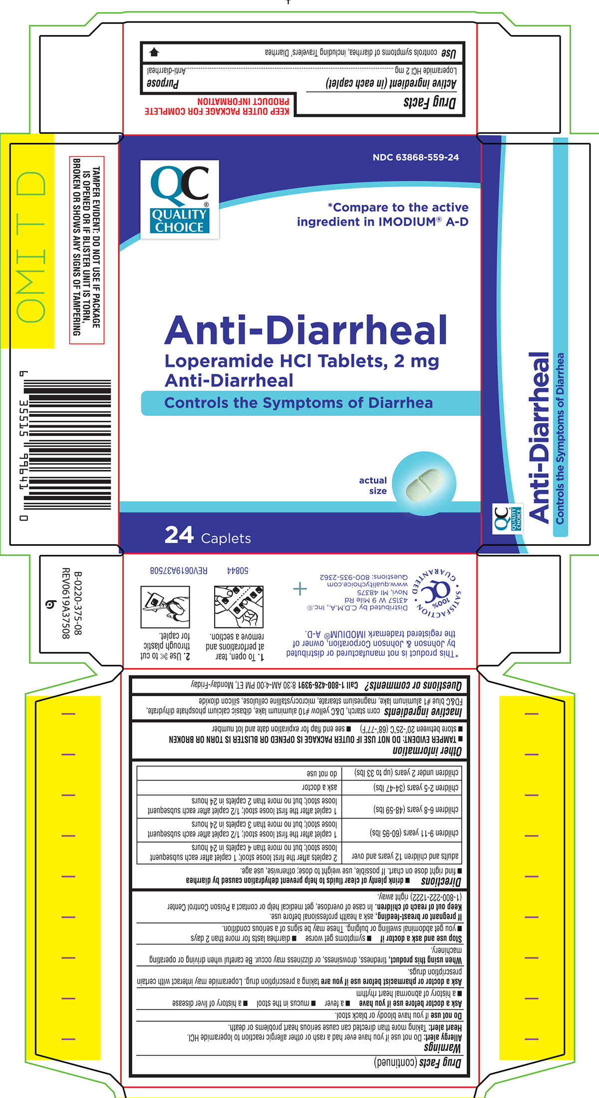 The following image provide visual information about the product associated with Anti Diarrheal NDC 63868-559 by Chain Drug Marketing Association Inc, such as packaging, labeling, and the appearance of the drug itself. This resource could be helpful for medical professionals, pharmacists, and patients seeking to verify medication information and ensure they have the correct product.