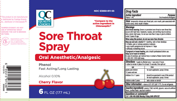 The following image provide visual information about the product associated with Sore Throat Cherry NDC 63868-811 by Quality Choice (chain Drug Marketing Association), such as packaging, labeling, and the appearance of the drug itself. This resource could be helpful for medical professionals, pharmacists, and patients seeking to verify medication information and ensure they have the correct product.