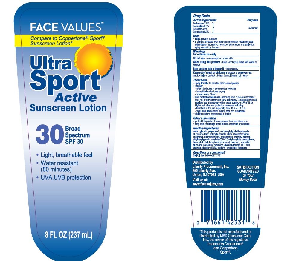 This is a sunscreen lotion with a broad spectrum of SPF 30. It has a light, breathable feel and is water-resistant up to 80 minutes. The lotion protects from UVA and UVB rays. The product has directions for use. It's distributed by Liberty Procurement. No further information available.*