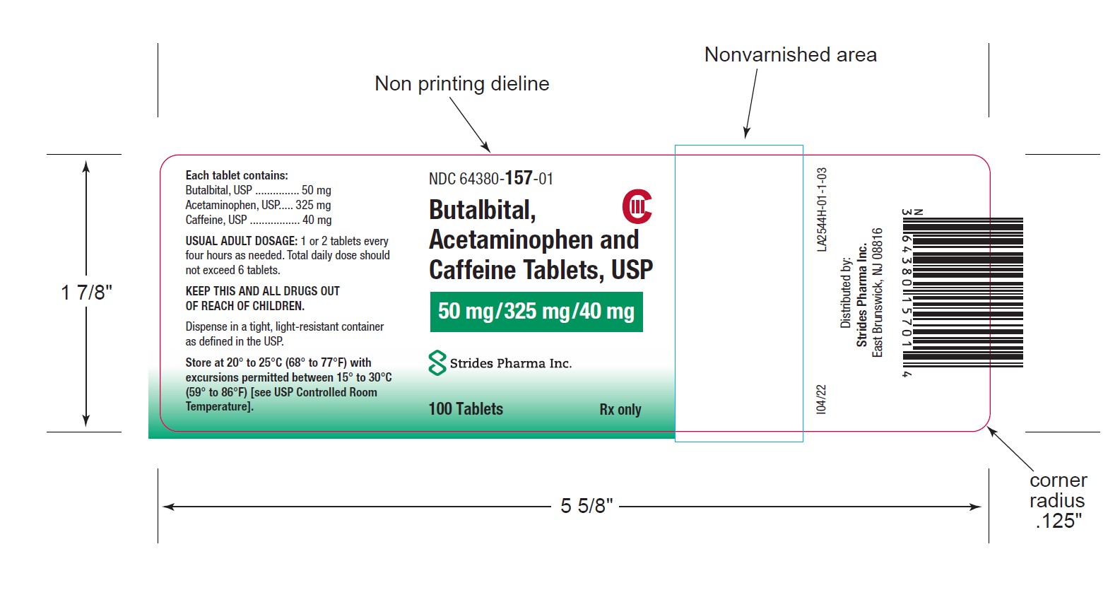 This is a description of a medication containing Butalbital, Acetaminophen, and Caffeine. It is advised for adults to take 1 or 2 tablets every 4 hours as needed, with a maximum of 6 tablets per day. The medication should be stored in a light-resistant container. The tablets were manufactured by Strides Pharma Inc, with the national drug code (NDC) 64380-157-02. There is also an image containing a non-printing dieline and a non-varnished area with a corner radius of A28.*