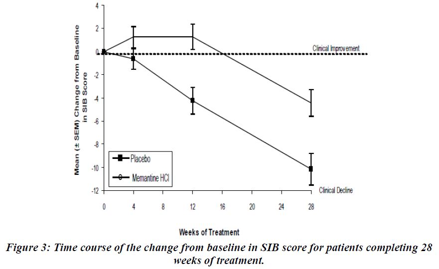 This is a visual representation of the change from baseline in SIB score for patients completing 24 weeks of treatment. The chart shows the mean (+ SEM) change from baseline for two different treatment groups: Placebo/Donepezil and Memantine HCI/Donepezil. The x-axis indicates the weeks of treatment and the y-axis indicates the change from baseline in the SIB score. The chart also indicates whether clinical improvement or decline occurred over time.*