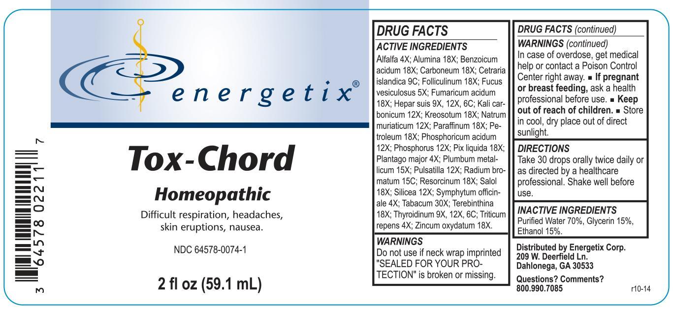 The following image provide visual information about the product associated with Tox-chord NDC 64578-0074 by Energetix Corp, such as packaging, labeling, and the appearance of the drug itself. This resource could be helpful for medical professionals, pharmacists, and patients seeking to verify medication information and ensure they have the correct product.