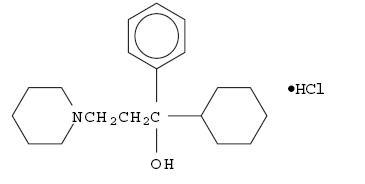 Trihexyphenidyl HCl is a synthetic antispasmodic drug. It is designated chemically as α-Cyclohexylα-phenyl-1-piperidinepropanol hydrochloride and its structural formula is as follows: