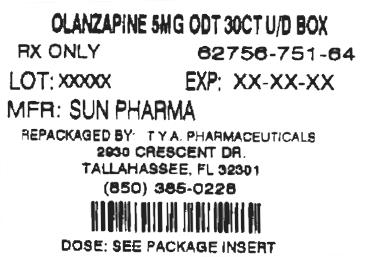 This is a description of a medicine called Olanzapine. The package contains 30 orally disintegrating tablets with a strength of 5mg. It is only available with a prescription and the package number is 62756-751-84. There is also information about the manufacturer, Sun Pharma, and the packaging company, TY A. Pharmaceuticals. The medication should be dosed according to the instructions provided in the package insert. The description also provides a lot number and expiration date, but they are not specified.*