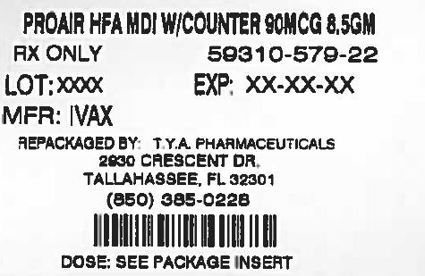 This is a description of a medication called ProAir HFA MDI with a counter, containing 8.5 grams and 90 mcg per inhalation. It is intended for asthma treatment and is available by prescription only (AX ONLY). The medication is packaged by T.Y.A Pharmaceuticals in Tallahassee, Florida, and the package includes dosage information that is not provided in this text. The lot number is 00X and the expiration date is not available (XX-XX-XX).*