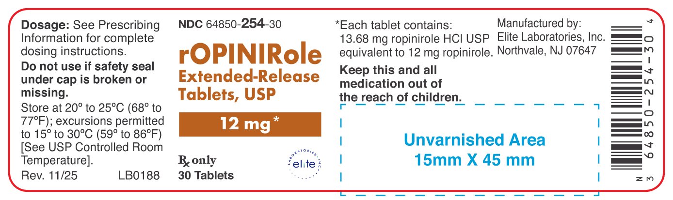 This text provides information about the dosage and administration of a medication containing 13.68 mg of ropinirole HCI USP, equivalent to 12 mg ropinirole. It also includes details on storage conditions and manufacturing information by Elite Laboratories, Inc. Dosage instructions along with precautions like checking the safety seal under the cap are highlighted. The text specifies to store the tablets at specific temperature ranges and conditions outlined by the USP Controlled Room Unvarnished Area guidelines.*